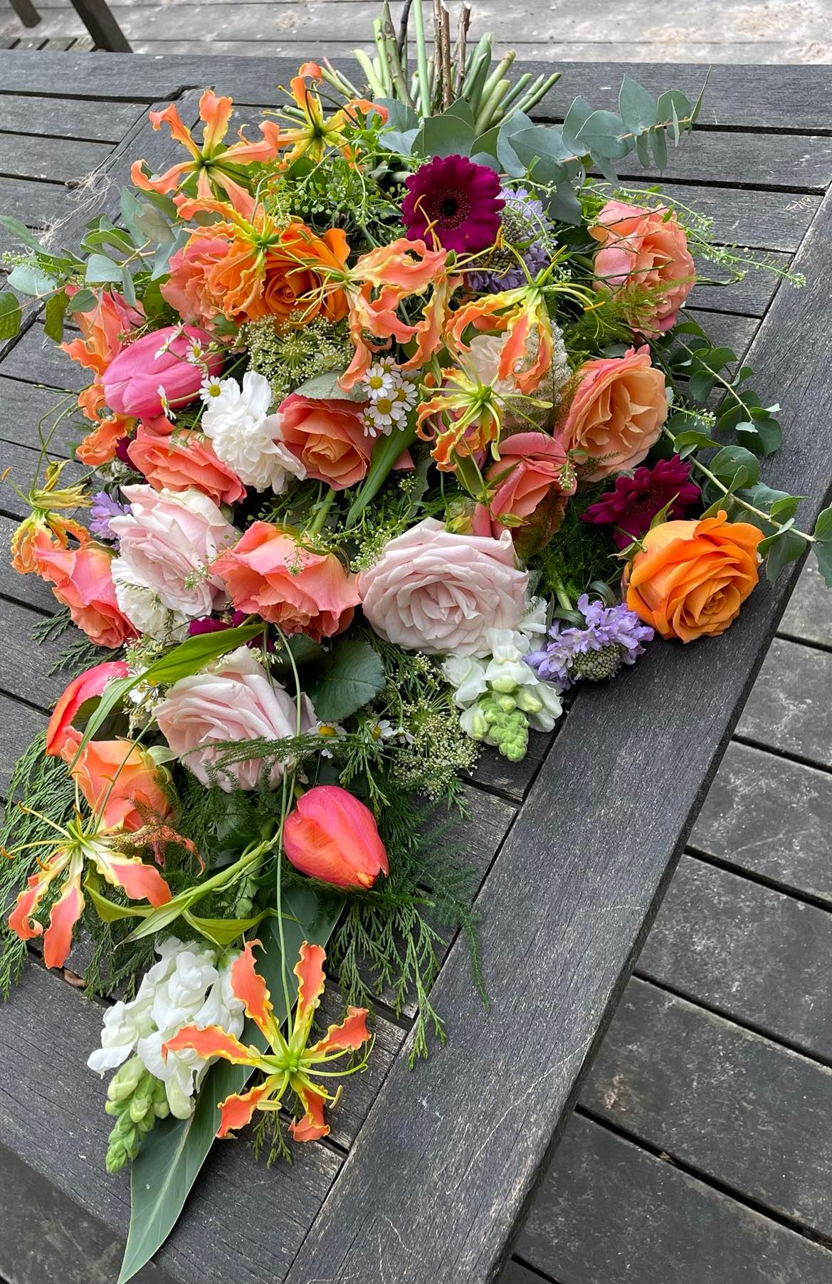 Ved kistepyntning og bårebuketter er det vigtigt, at blomstervalget harmonerer med kistens form og kundes ønske - vi rådgiver og vejleder selvfølgelig med dette i en besværlig tid.