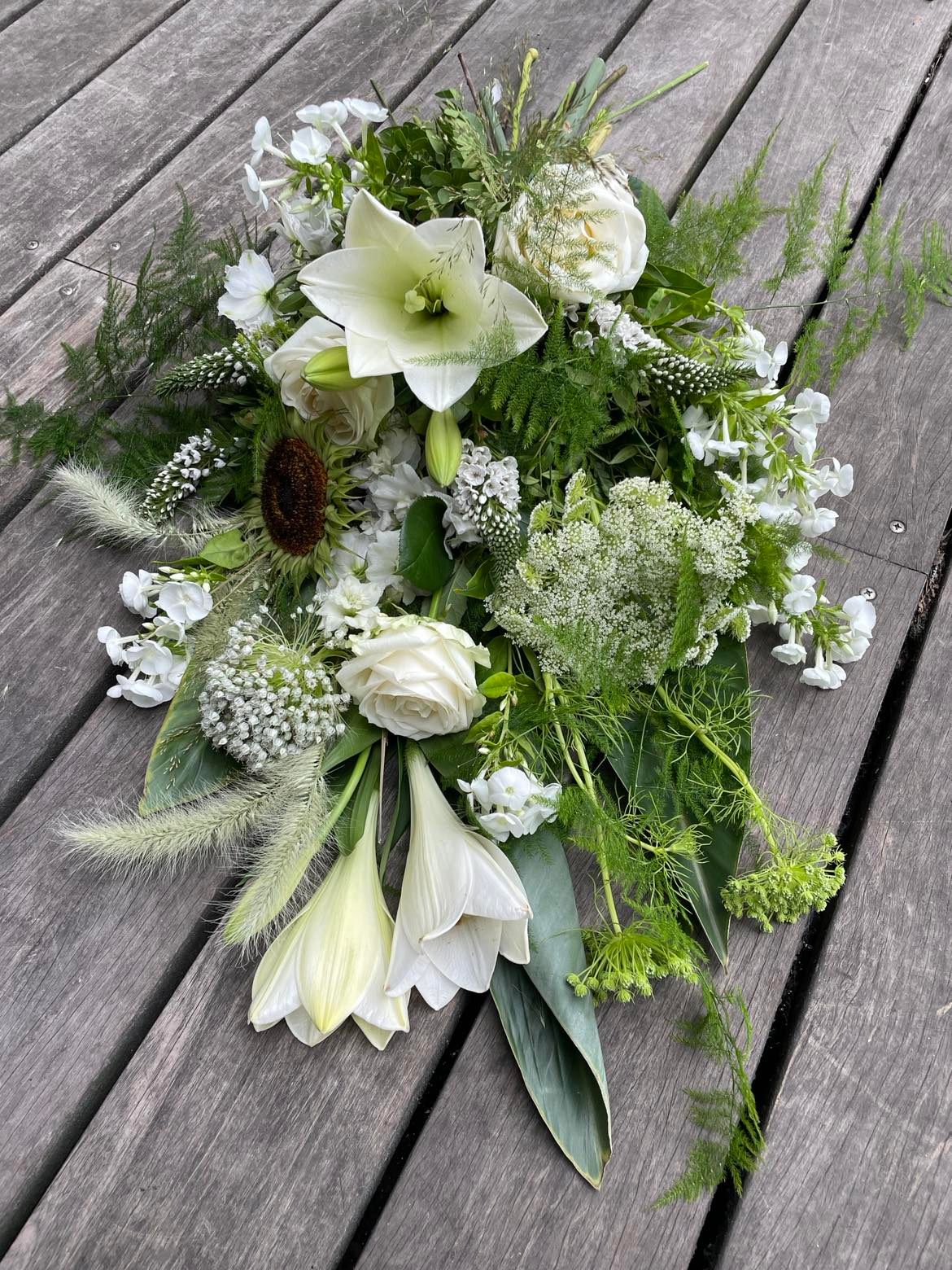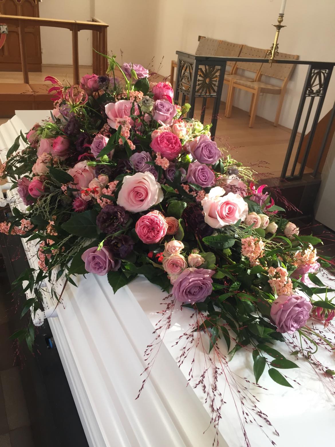 Vi leverer selvfølgelig både kistepynt og bårebuketter i kirken inden begravelsen.