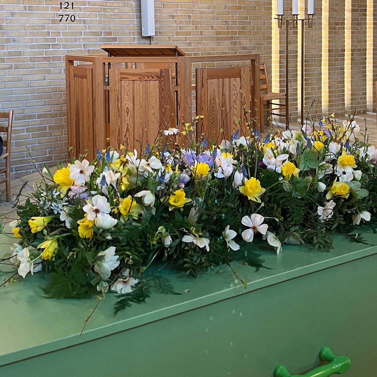 Dette er et eksempel på en kistepynt i en mere naturlig stil a la et blomsterbed (eller lignende). Bemærk, at blomster varierer efter årstiden.